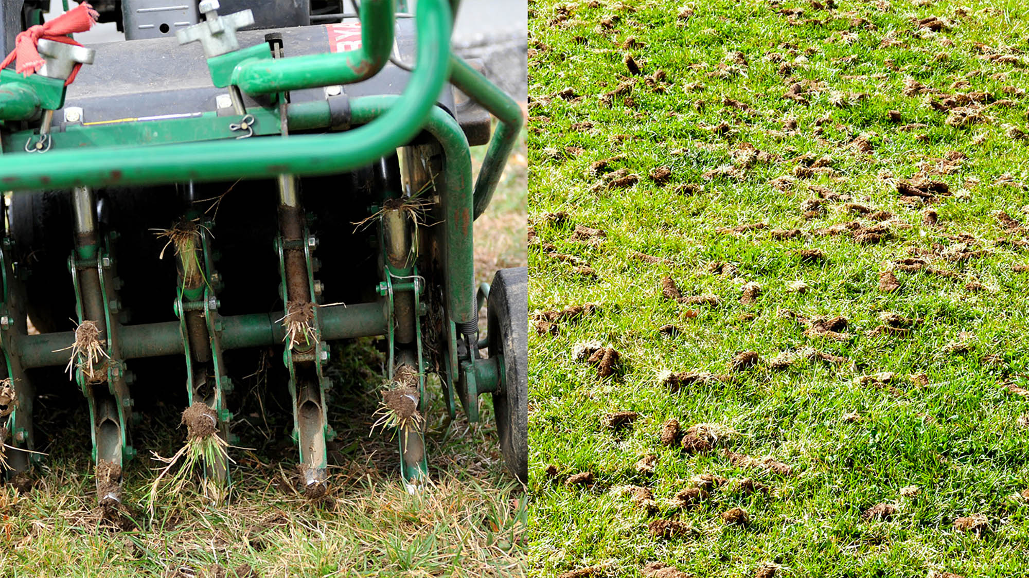 - While removing cores of soil, the spoons or tines also sever roots, rhizomes and stolons. Grass plants are stimulated to produce new shoots and roots that “fill up” the holes in the lawn and increase the density of the turf.